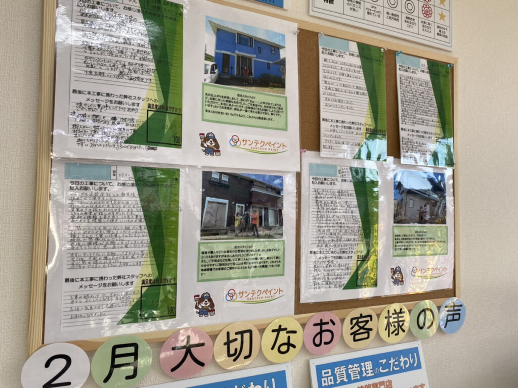 ↑ショールームにもお客様のアンケート・生のご評価を展示させていただいています。ご来店いただいた際には是非ご覧ください★