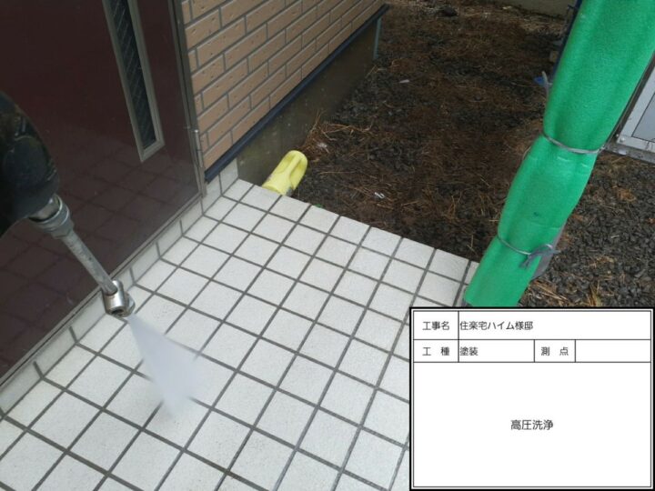 外壁の高圧洗浄です。汚れや古い塗膜を除去します。